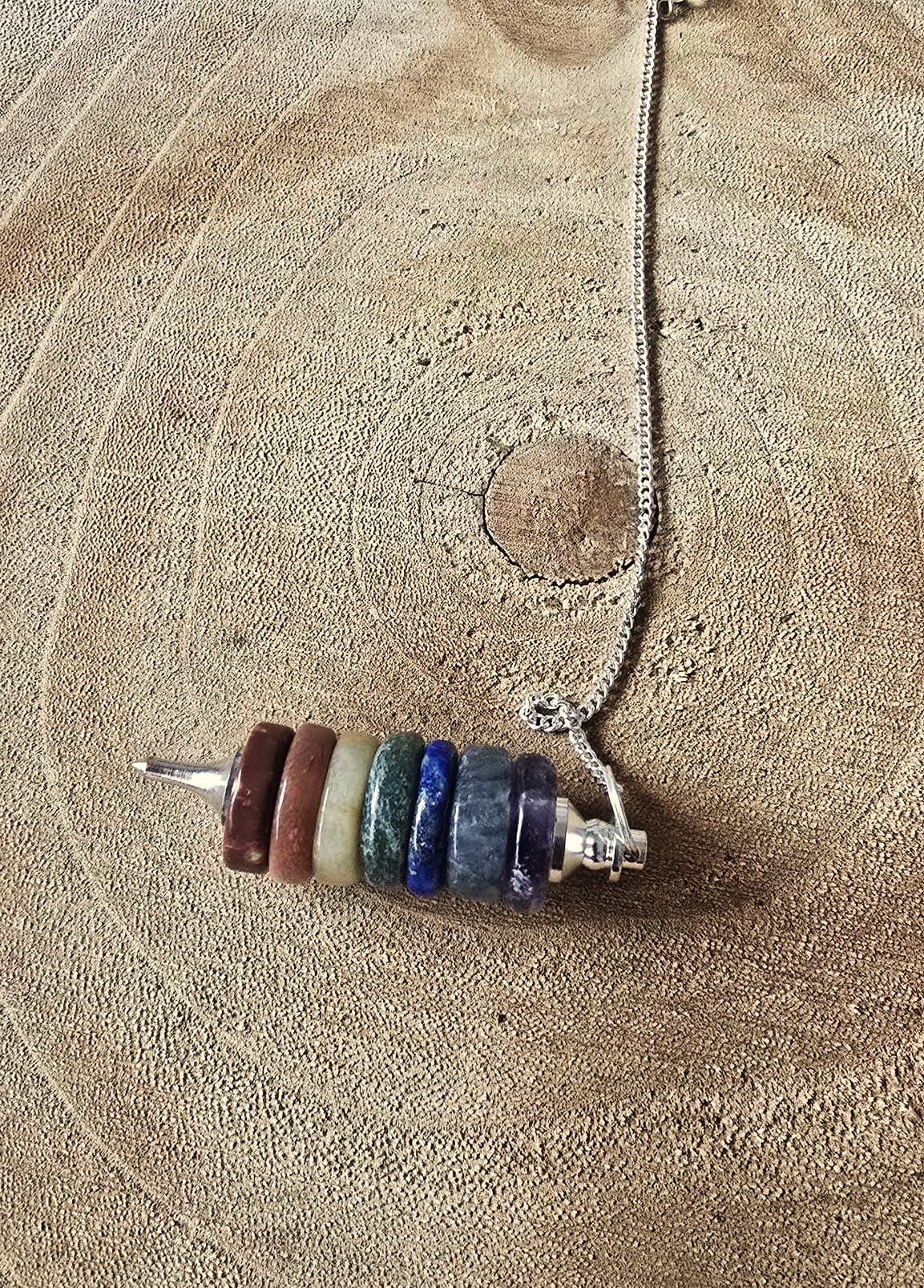 Kyvadlo čakrové kulaté složené ze sedmi diskových vrtaných kamenů s kovovou špičkou a řetízkem z postříbřeného kovu 15 cm a kuličkou na konci. Cena je za kus.